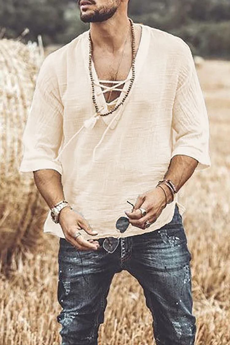 Men's Casual Front Lace Up V Neck Half Sleeve Loose Shirt