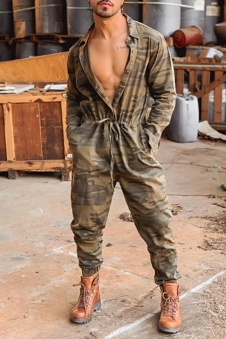 Camo Tunic Lapel Long Sleeve Cargo Pant Jumpsuit