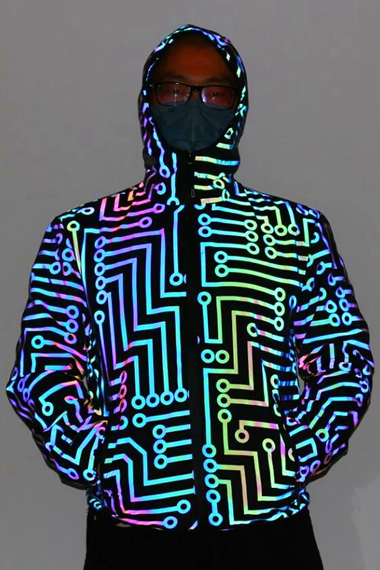 Fluorescent Circuit Pattern Reflective Hooded Zipper Festival Jacket