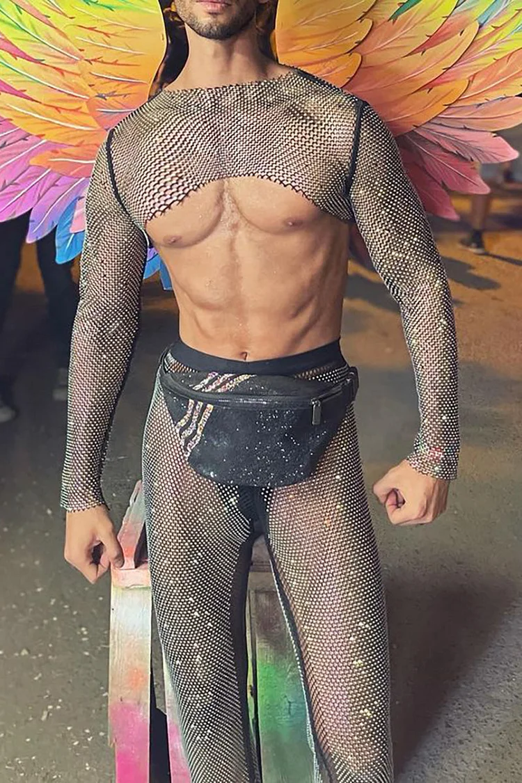 Mesh See Through Rhinestone Long Sleeve Crop T-Shirt