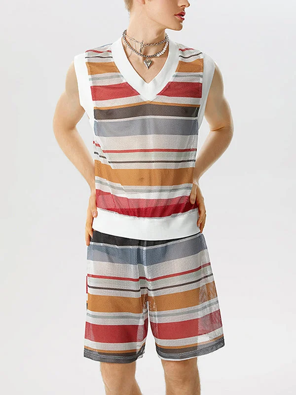 Mens Colorful Striped Mesh Two Pieces Outfits