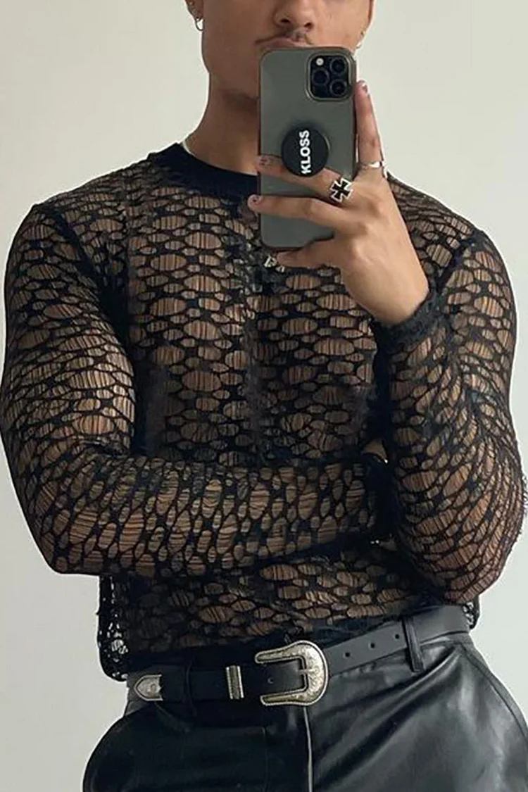 Men's Daily Black Mesh See-Through Shirt