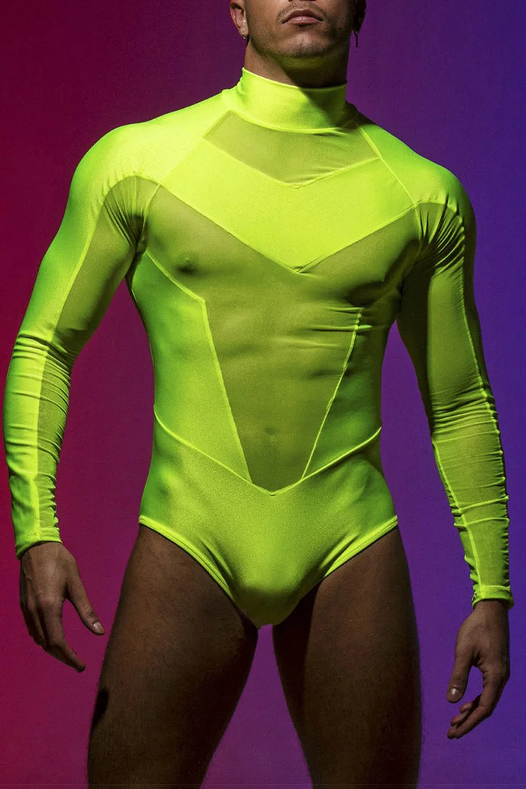 See Through Mesh Patchwork Back Zipper Stretchy Lime Green Bodysuit