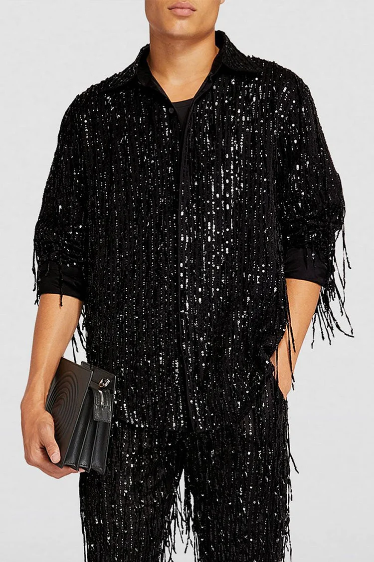 Sequin Fringe Turndown Collar Long Sleeve Loose Fit Shirt [Pre-Order]