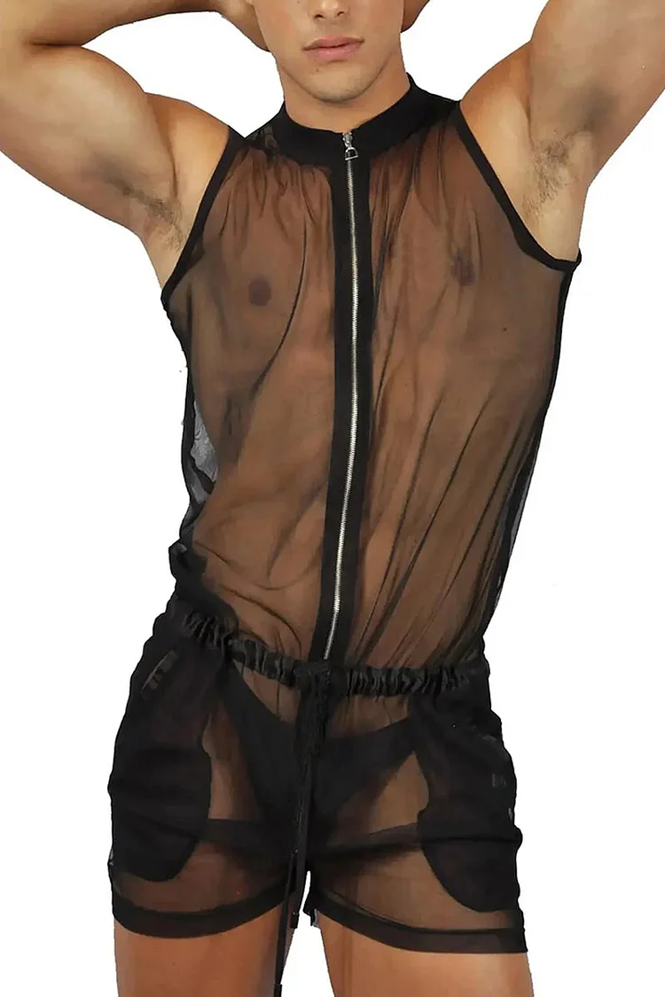 Men's Zipper Designed Black See Through Mandarin Collar Sleeveless Romper